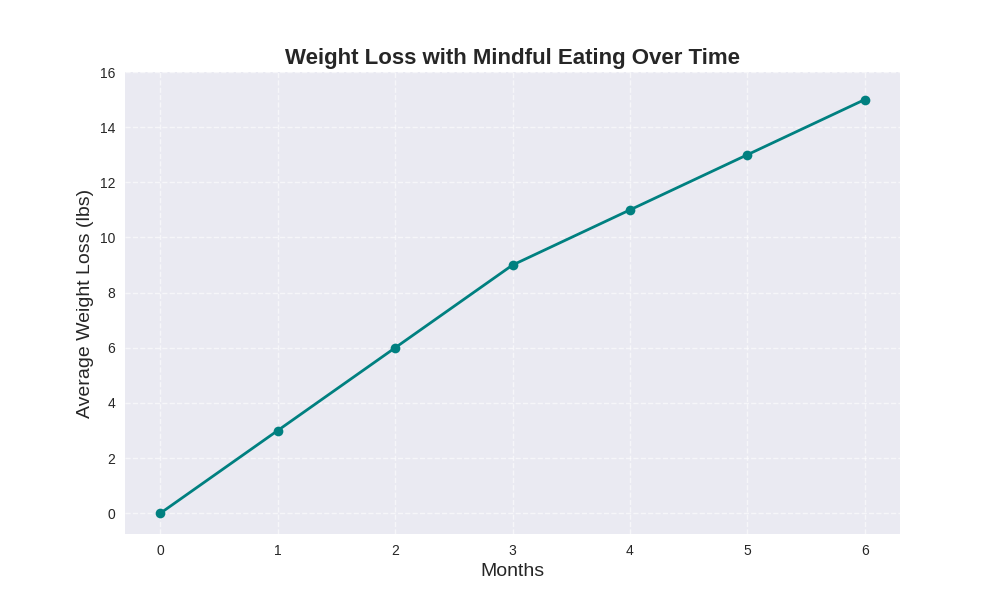 This graph illustrates how consistent mindful eating practices—like slowing down, tuning into hunger cues, and eating without distractions—can lead to sustainable, long-term weight loss. It reinforces the idea that mindfulness isn’t a quick fix, but a powerful lifestyle shift.