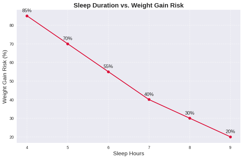 💡 Why It Matters: This graph reinforces the core message of your blog post—sleep isn’t just rest, it’s a metabolic regulator. Inadequate sleep disrupts hunger hormones like ghrelin and leptin, increases cortisol, and makes high-calorie foods more tempting. Prioritizing 7–9 hours of quality sleep can dramatically reduce weight gain risk and improve overall health.